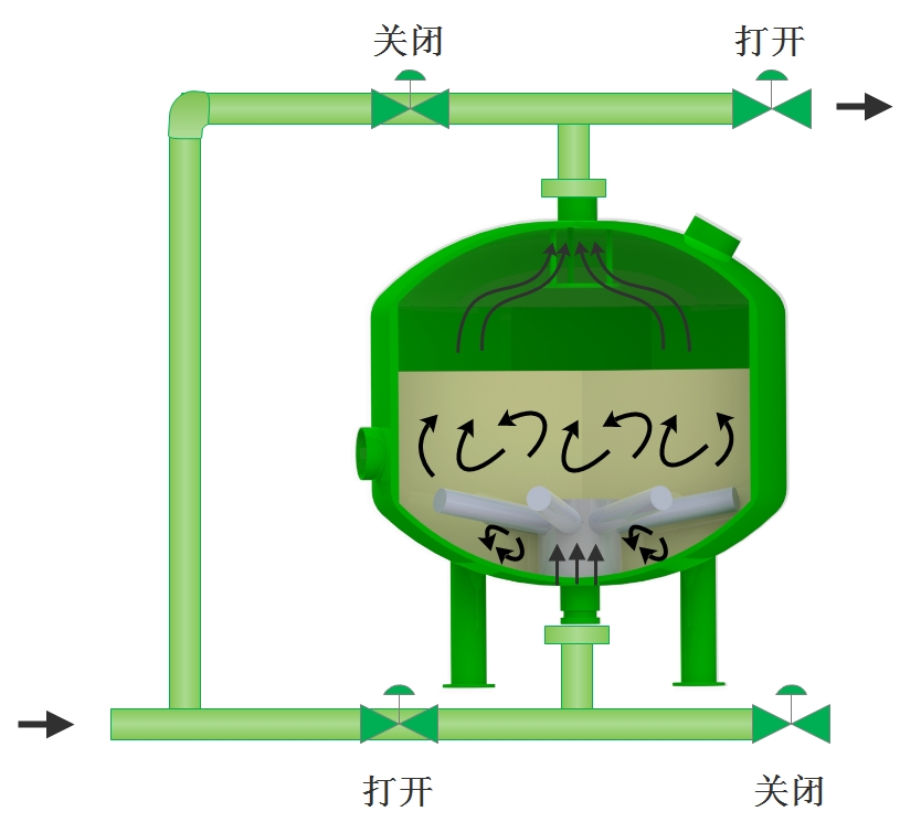 隨時(shí)雜質(zhì)在濾料層中不斷聚積,壓力損失不斷增加,當(dāng)壓差增加到某一設(shè)定值時(shí)或到達(dá)設(shè)定的清洗時(shí),系統(tǒng)將自動(dòng)轉(zhuǎn)換至反洗狀態(tài)。加壓水通過集水裝置進(jìn)入濾料層,對(duì)其進(jìn)行沖刷,使截留的污染物脫落并排出過濾系統(tǒng)。反洗持續(xù)至少2分鐘后,閥門自動(dòng)將系統(tǒng)轉(zhuǎn)至過濾狀態(tài)。